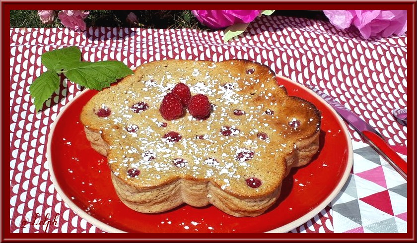 - Verser le tout dans un moule à manqué, beurré si il n’est pas en silicone, enfoncer délicatement les framboises dans la pâte.