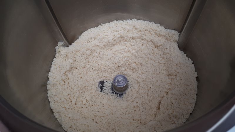 - Mettre dans le bol, la farine de maïs, la farine blanche, la levure et la noix de coco râpée, mélanger 20sec/vit3. Incorporer l’extrait de vanille et le lait puis mélanger 20sec/vit3.