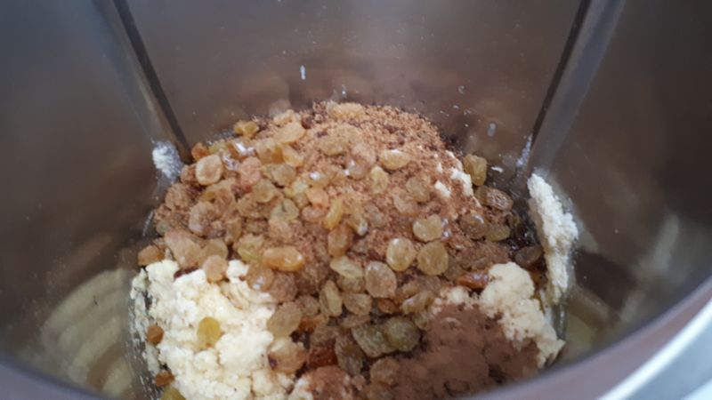 - Ajouter les raisins, le sucre, la muscade et la cannelle, mélanger de nouveau soigneusement, puis verser l’eau froide et le beurre fondu et pétrir jusqu’à obtention d’une boule de pâte.