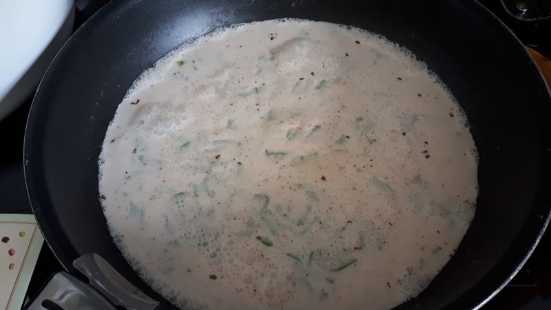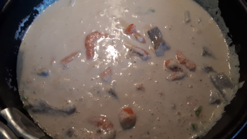 - Dans un wok mettre l’eau, le lait de coco, la pâte de piment, le piment, le bouillon thaï, le sel et le poivre puis porter à petite ébullition pendant 5 minutes.