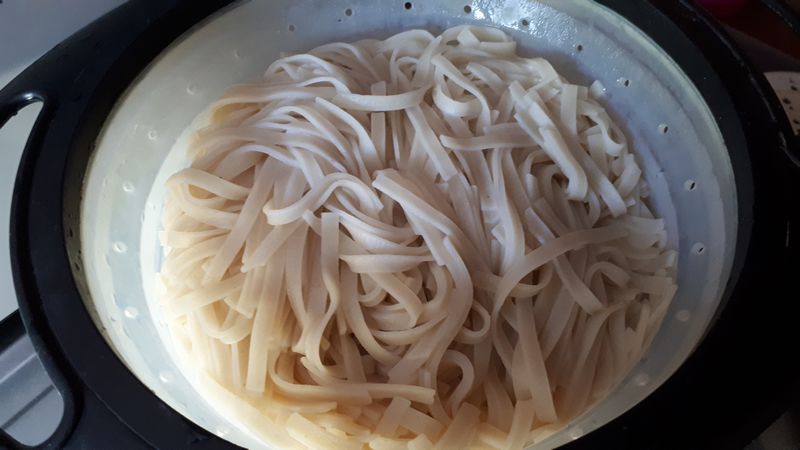 - Faire cuire vos tagliatelles de riz, les faire tremper 10 minutes dans un récipient d’eau froide, les égoutter puis les faire cuire 5 minutes dans de l’eau bouillante salée. Égoutter et réserver.