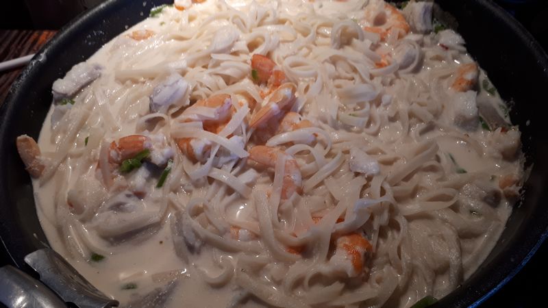- Ajouter le poisson et les crevettes, mélanger, laisser chauffer sur feu moyen pendant 5 minutes environ, ajouter les tagliatelles de riz égouttées, mélanger et laisser chauffer encore 5 minutes.