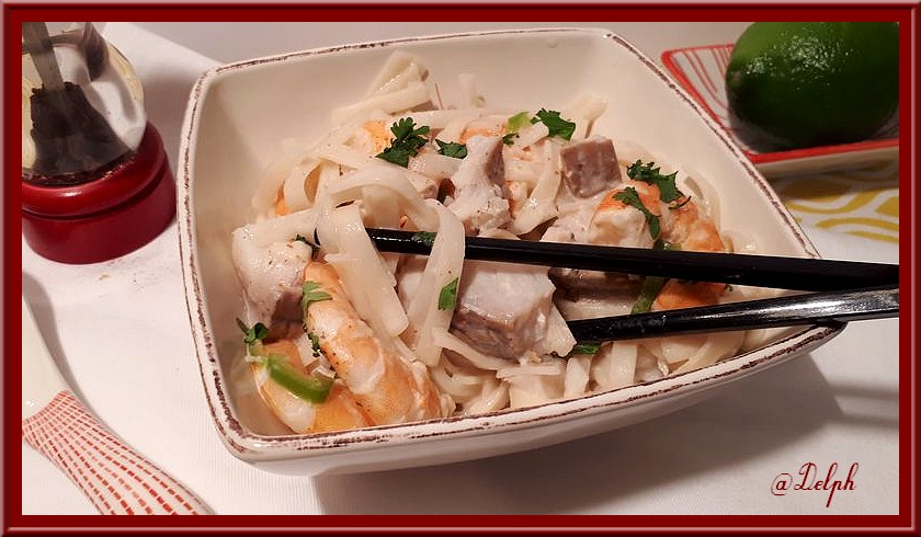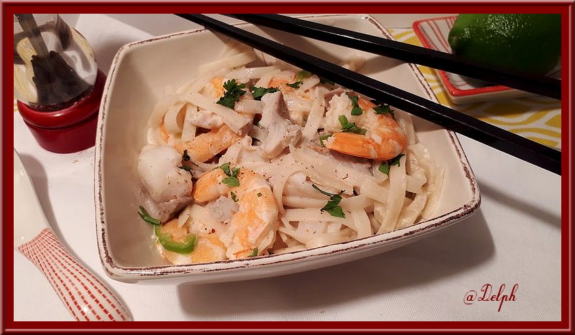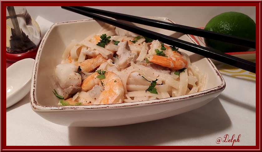 Lorsque j’ai lu tagliatelles de riz je ne comprenais pas trop.. Ce sont les pâtes asiatiques ? Tu les as merveillesement bien accompagnées avec ces crevettes et poisson ! ce plat a pour pour un petit goût de reviens y ! bon dimanche delphine ! gros bisosu