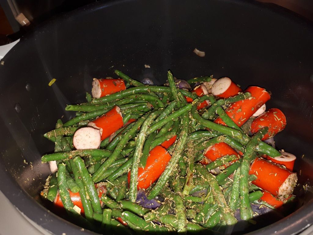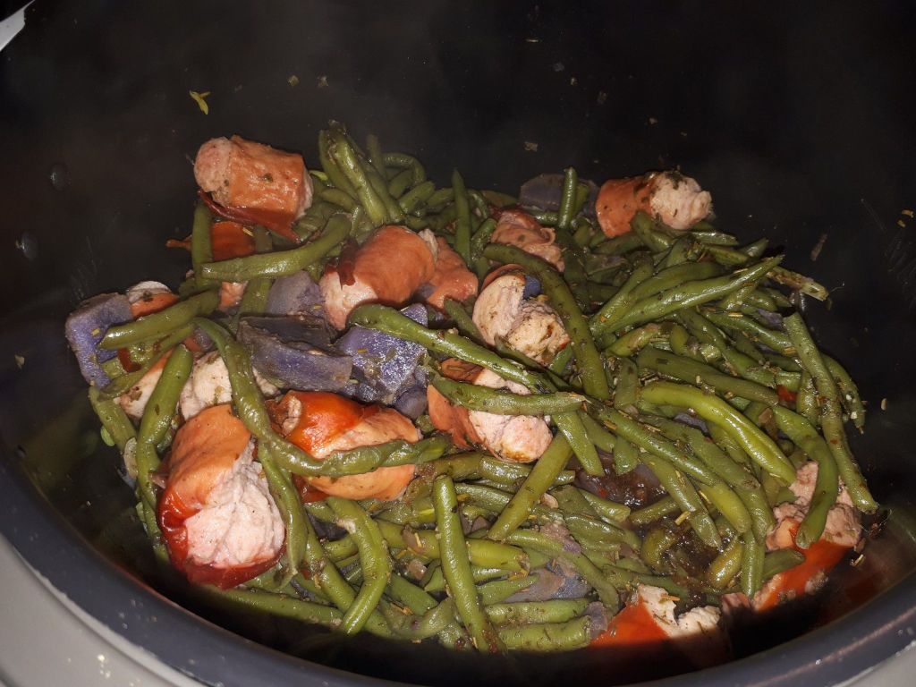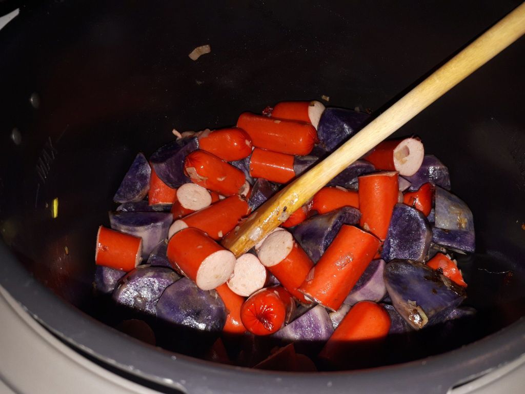 - Couper les saucisses en trois, les ajouter mélanger à nouveau et laisser dorer encore 2 minutes. Ajouter les haricots verts équeutés et lavés, le bouillon, le mélange pommes sautées, le sel et le poivre, mélanger puis passer en mode sous pression pour 8 minutes.