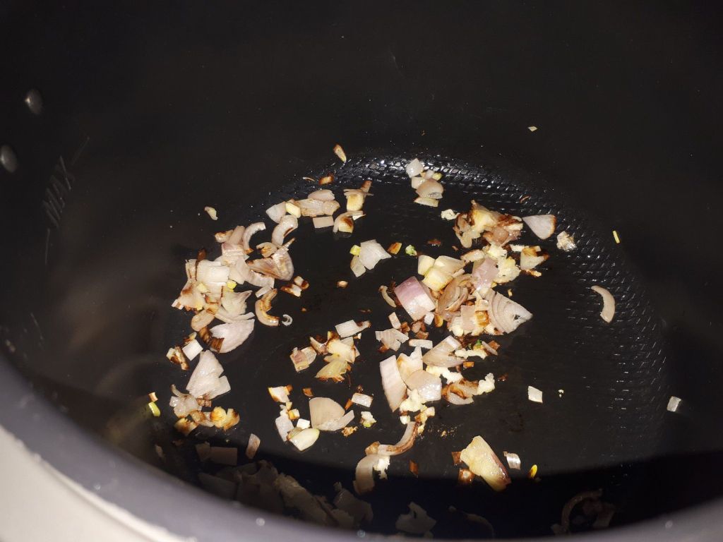 - Mettre le cookéo en mode dorer, éplucher et ciseler vos échalotes, presser l’ail, déposer le tout dans la cuve avec l’huile d’olive puis faire dorer environ 1 minute en mélangeant.