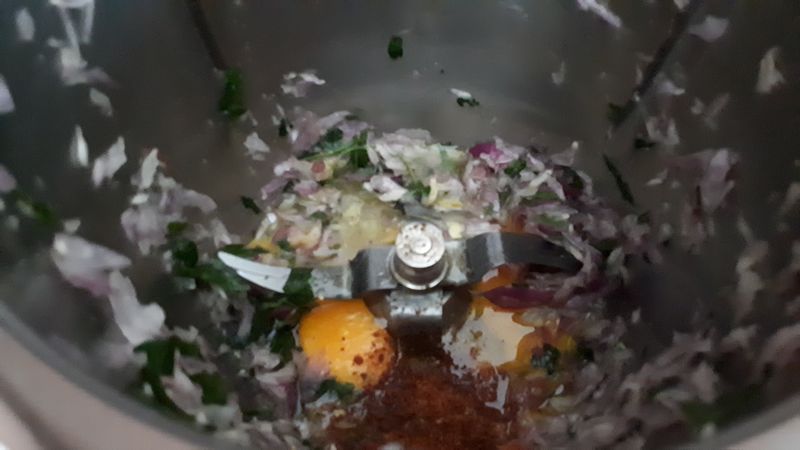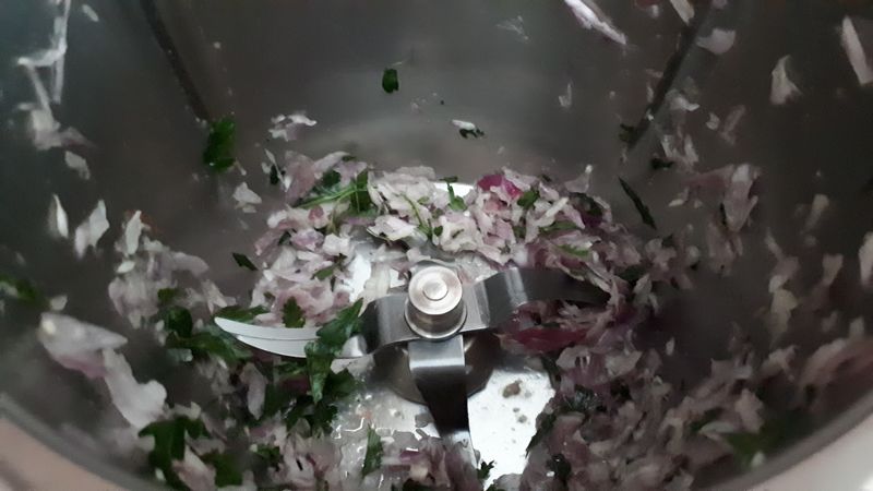 - Éplucher et couper les échalotes en deux les placer dans le bol du Thermomix avec les feuilles de persil, mixer 5sec/vit5, racler les bords et mixer à nouveau 4sec/vit5.