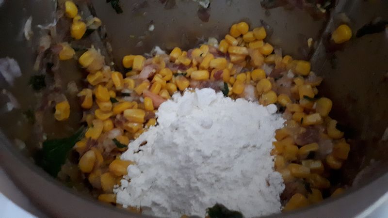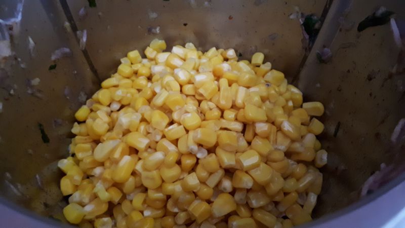 - Incorporer les grains de maïs, les crevettes, mélanger 20sec/couteau inversé/vit3, ajouter la farine et mélanger à nouveau 15sec/couteau inversé/Vit3.