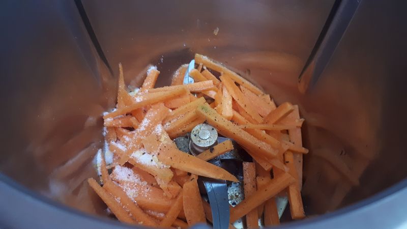 - Éplucher les carottes et les débiter dans le sens de la longueur en très fins bâtonnets. les mettre dans le bol du thermomix avec 2 cuillerées à soupe d’huile et le sucre puis faire chauffer 6 min/varoma/couteau inversé//vit mijotage. A la sonnerie, réserver dans une assiette creuse, ne pas rincer le bol.