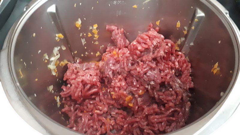 3. Ajouter le concentré de tomates, le sel, le poivre et faire cuire 2min/100°C/vit1, ajouter la viande hachée et faire cuire 2min/100°/vit2. Transvaser dans un saladier.