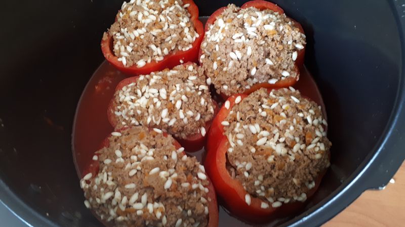 1. Dans un bol mélanger la purée de tomates avec l’eau et le sel, mettre ce mélange dans la cuve du cookéo puis placer les poivrons sur le dessus.
