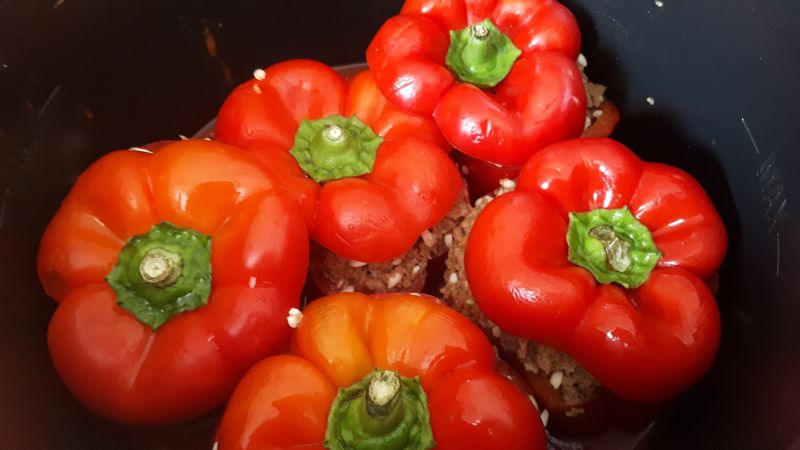 6. Remplir les poivrons avec la farce (sans excès, le riz va encore un peu gonfler à la cuisson), remettre le chapeau par-dessus.