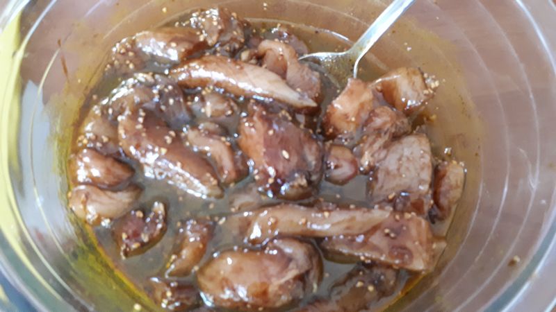 - Mélanger tous les ingrédients , sauce soja, huile d’olive, vinaigre balsamique, curcuma et ail.