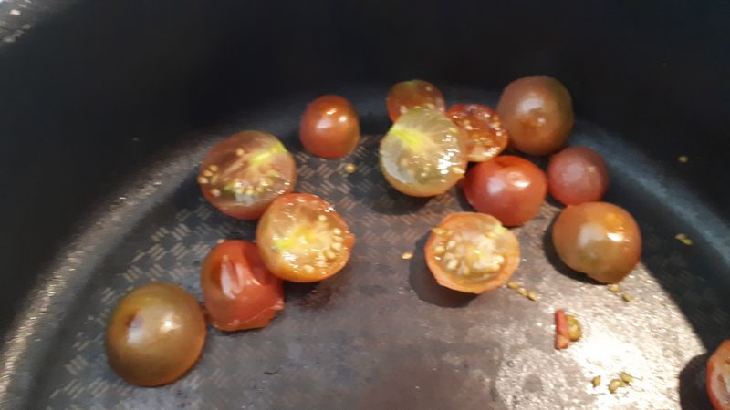 - Dans une petite casserole anti adhésive, déposer vos tomates cerises coupées en deux et les faire chauffer une dizaine de minutes.