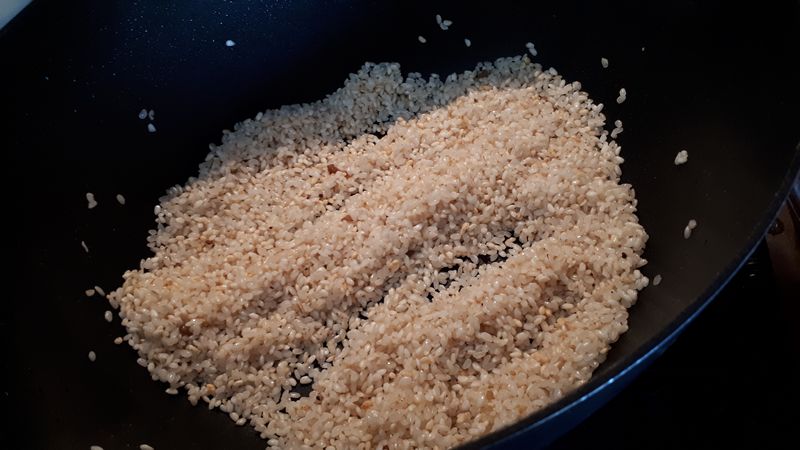 5. Laver le riz sous l’eau froide, bien l’égoutter, le mettre dans la cocotte, bien le mélanger avec la matière grasse et continuer à le remuer jusqu’à ce qu’il devienne translucide., mélanger ensuite avec la chair à saucisses.