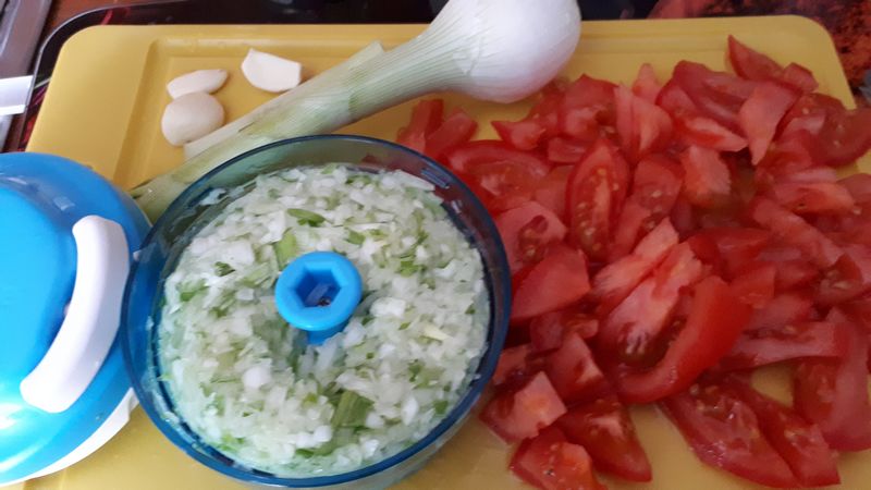 2. Dans une grande casserole profonde, mettre les tomates coupées en dés, les oignons et le vert hachés ainsi que les gousses d’ail, avec la cuillère à soupe d’huile, le concentré de tomates, et le cube de bouillon mélanger pendant 10 minutes environ sur feu moyen.