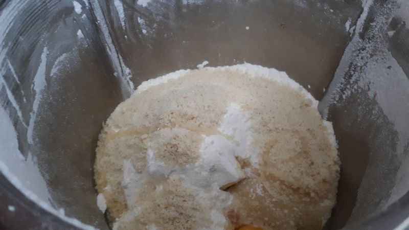 - Dans un cul de poule, mettre la farine, le sucre glace, les amandes en poudre, et le beurre.
