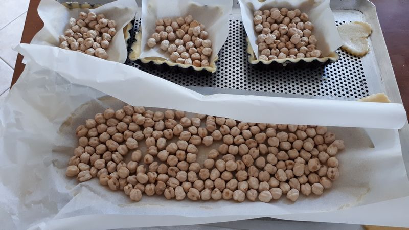 - Enfourner vos tarte et les laisser cuire 15 minutes environ, les sortir, enlever les pois chiches et remettre 5 minutes ou plus selon votre four, votre pâte doit être légèrement dorée, la cuisson est à surveiller.