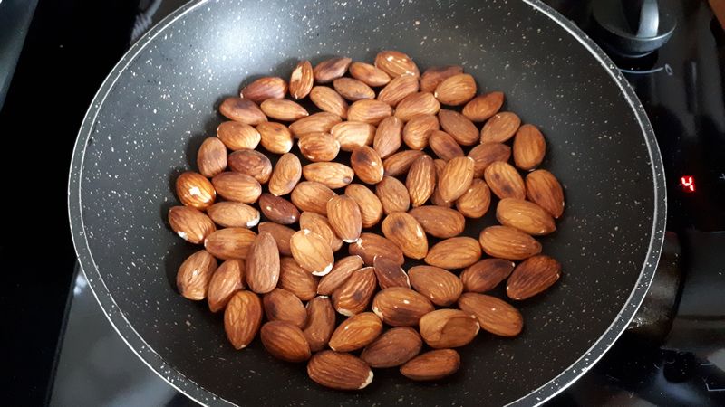 - Mettre les amandes dans une poêle et les faire torréfier à feu doux en remuant souvent.