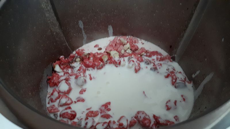 - Les mettre dans le bol du Thermomix et les concasser 5sec/vit5; ajouter les pralines roses, verser la crème sur le dessus et faire chauffer 8min30/110°C/vit2.