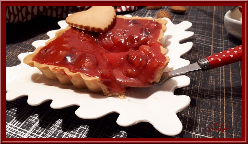 Une bien jolie tarte vêtue de rouge, éclatante et festive, j’imagine son goût hummmm, bon weekend, bisou