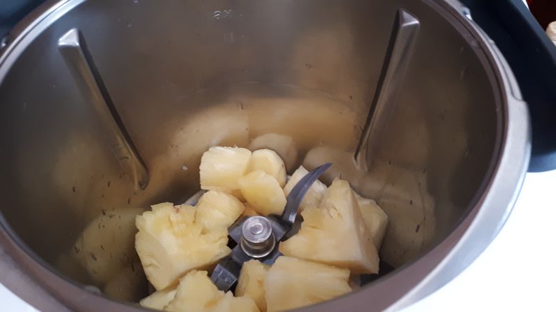 - Mettre le gingembre, l’ananas épluché et coupé en morceaux et le jus de citron dans le bol du Thermomix puis mixer 20sec/vit5.