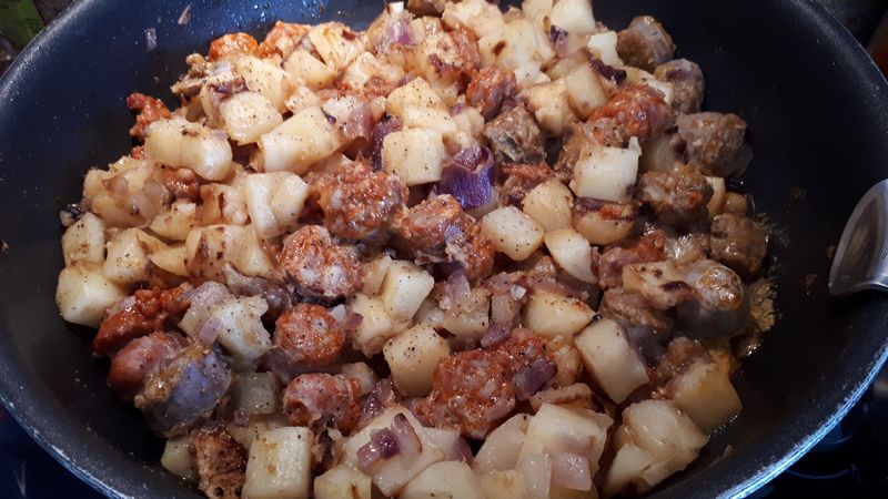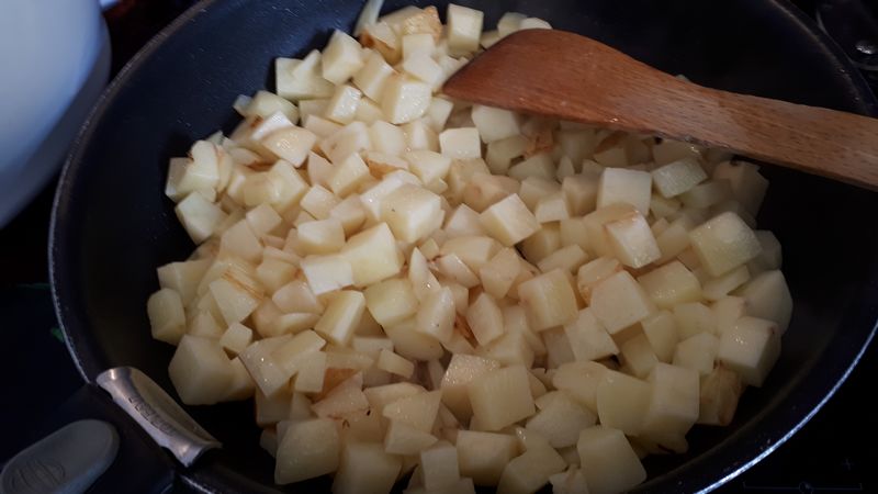 3. Éplucher et ciseler les oignons, les ajouter aux pommes de terre, mélanger et faire cuire encore 15 minutes..
