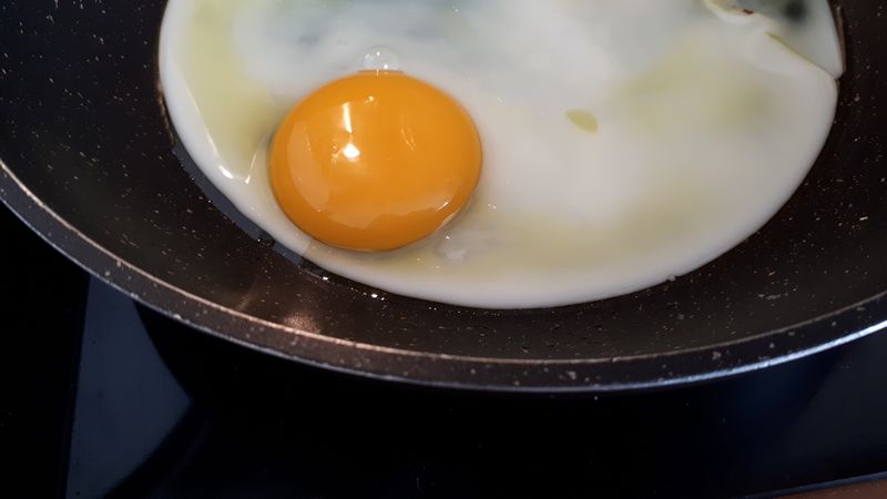 5. Dans une autre poêle, chauffer le reste d’huile, y faire frire les œufs, le blanc doit être ferme et le jaune coulant.