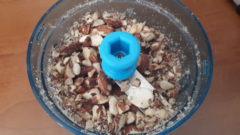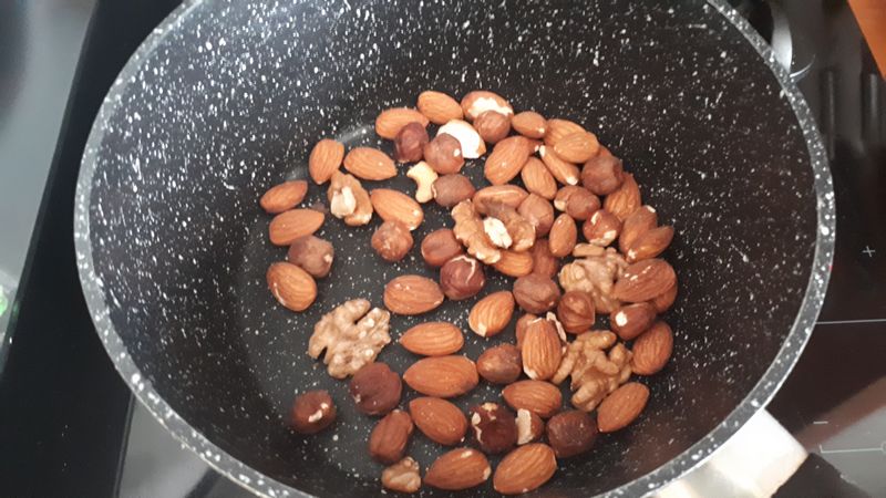 - Mettre les fruits secs dans une casserole et les faire torréfier, bien surveiller pour que cela ne brûle pas, cela va assez vite. Les hacher grossièrement.