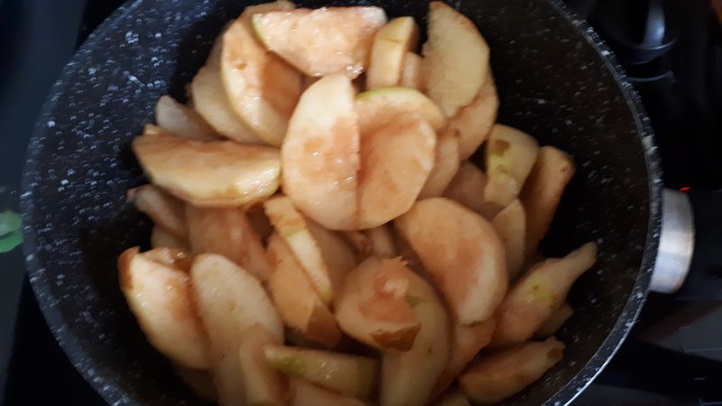 - Peler les pommes et les couper en quartiers, les faire dorer dans une casserole avec le beurre pendant 8 minutes à feu moyen, ajouter 2 cuillère à soupe de miel pour les faire légèrement caraméliser.