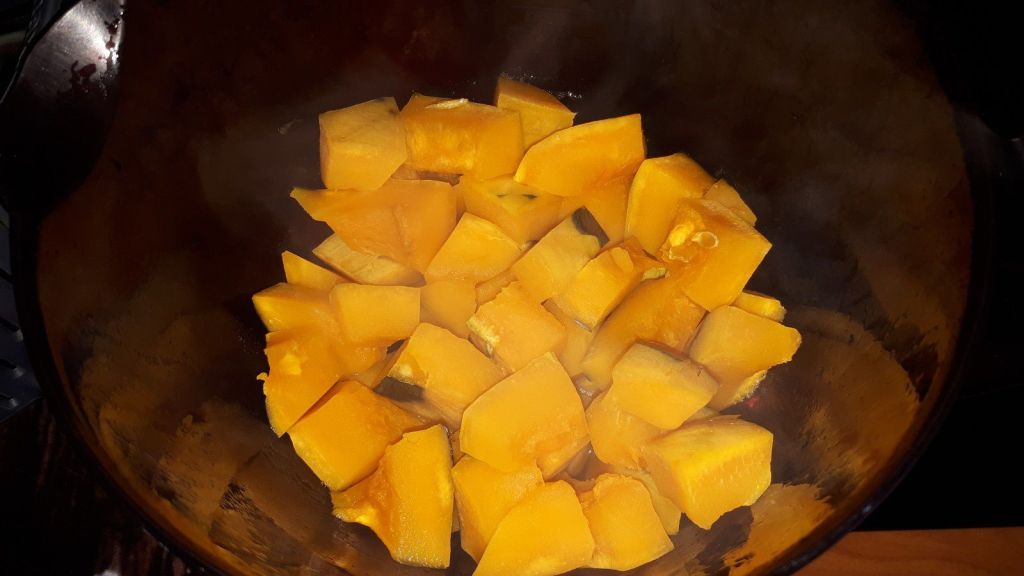 - Laver votre courge, enlever les graines, la peler et la couper en dés pas trop gros. Cette fois-ci j’ai testé la cuisson au micro-onde qui est idéale si vous êtes pressés.