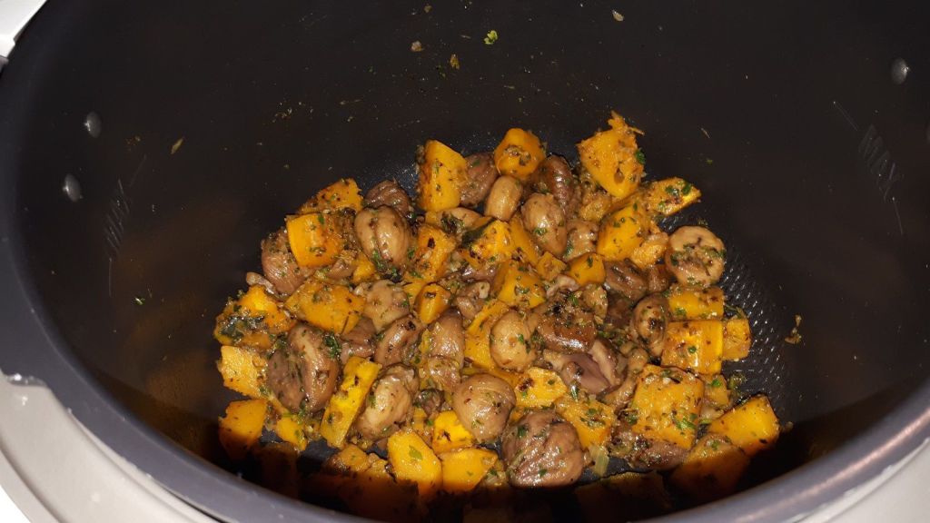 - Éplucher et ciseler votre oignon, laver et ciseler votre persil. Mettre votre cookéo en mode dorer, dès le préchauffage, faire revenir avec un peu d’huile la persillade, ajouter les châtaignes et la courge, puis faire dorer 5 minutes en mélangeant régulièrement, assaisonner à votre goût.