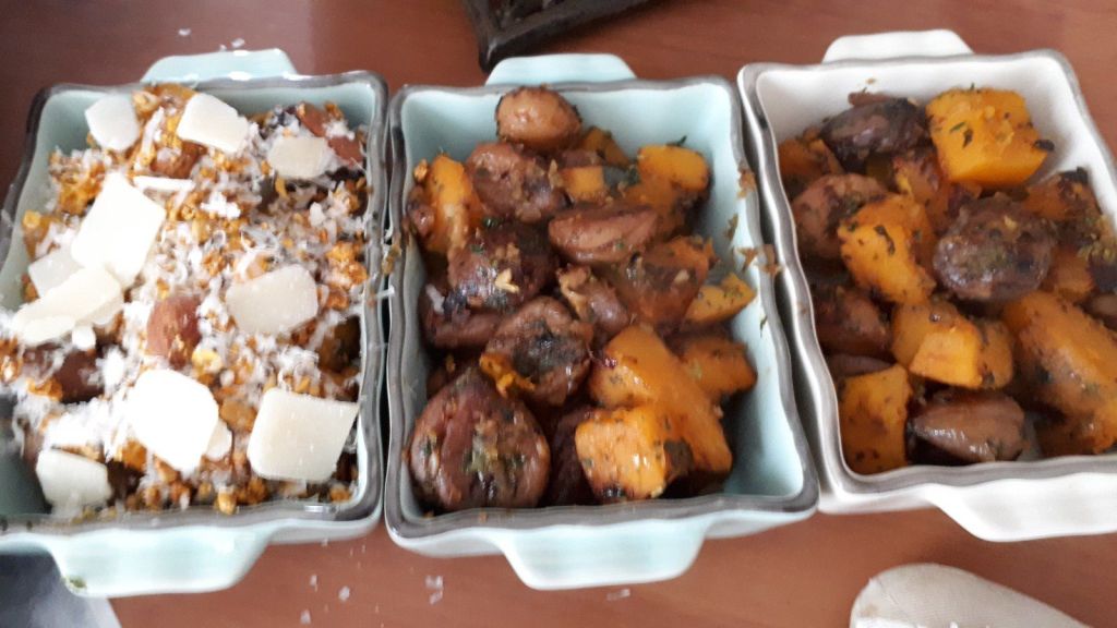 - Déposer dans des caquelons, les châtaignes et la courge, saupoudrer avec le crumble puis déposer quelques copeaux de parmesan.
