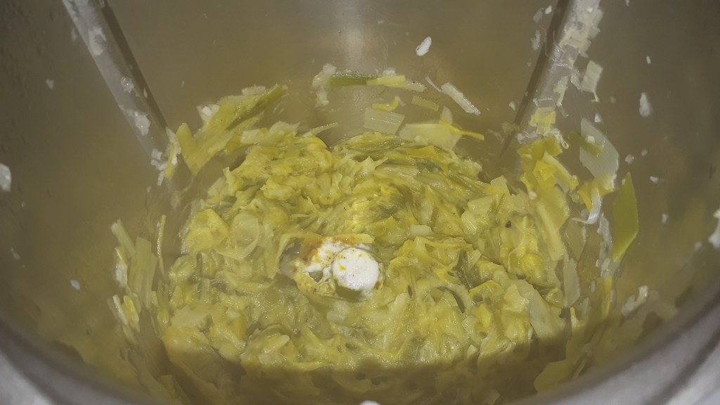- Ajouter vos poireaux lavés et coupés en rondelles, l’eau et faire chauffer 18min/120°C/couteau inversé/vit1 à la sonnerie ajouter le curry, la crème, le sel et le poivre puis mélanger 3min/100°/Couteau inversé/vit1.