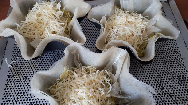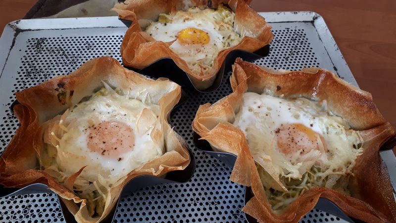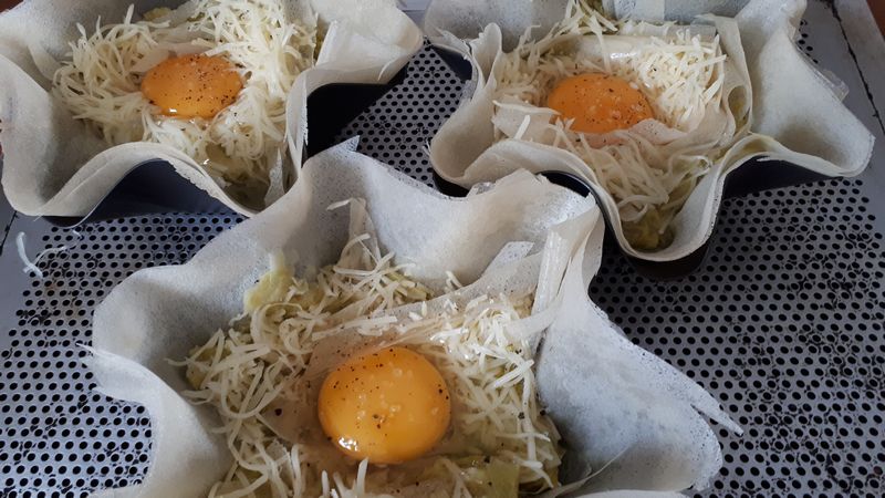 - Lorsque votre fondue de poireaux est prête la disposer sur les feuilles de brik, égoutter le jus de poireaux, mettre par dessus l’emmental râpé, puis faire un petit trou pour déposer votre œuf.
