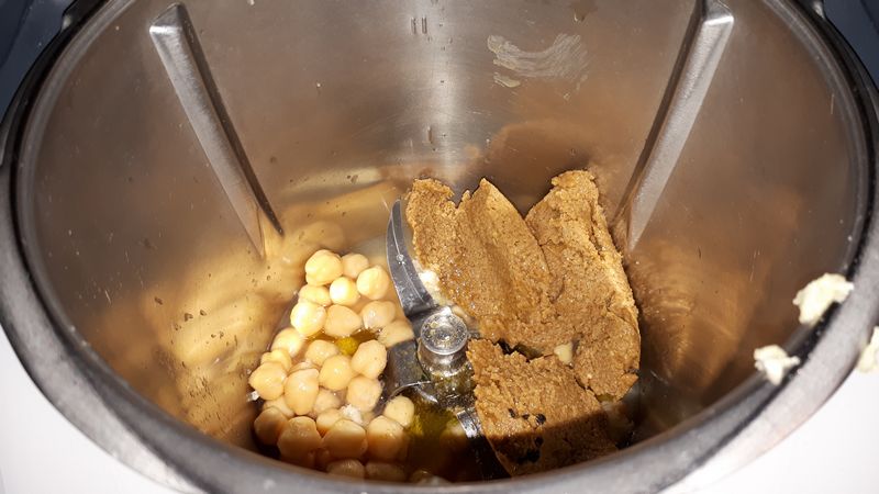 - Mettre les pois chiches, l’ail, le jus des citrons, le tahiné, l’huile, le cumin et quelques pincées de sel dans la cuve. Mixer 20sec/vit6. Racler les bords de la cuve et mixer à nouveau 20 sec en ajoutant un peu de jus de pois chiches pour détendre la préparation si nécessaire.