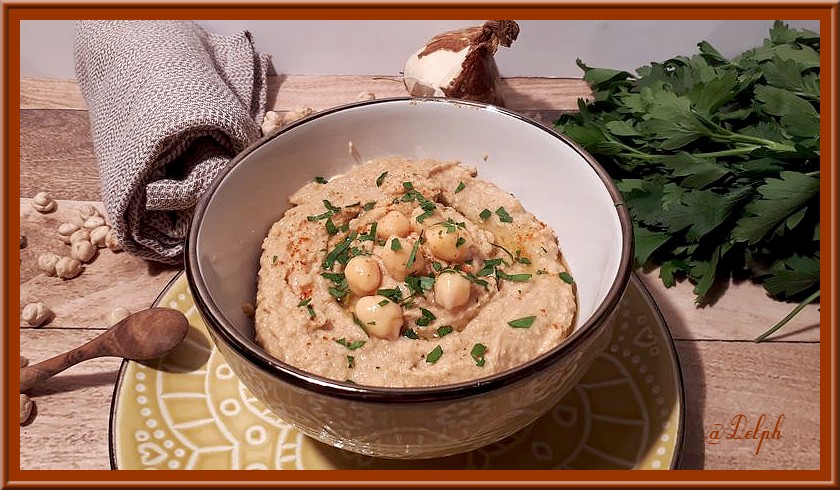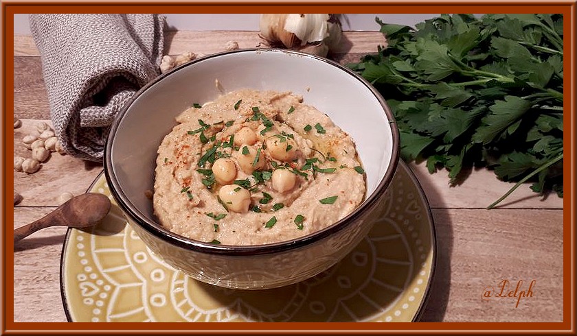 - Dresser le houmous dans un bol, ajouter les pis chiches réservés, un peu de persil ou de coriandre ciselée.
