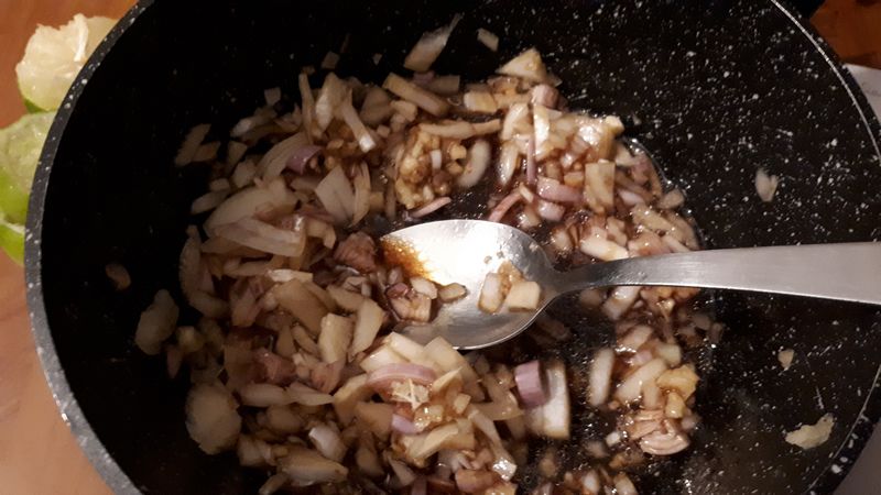 - Faire revenir à feu doux dans une casserole 3 cuillerées à soupe d’huile, 6 cuillerées à soupe de sauce soja salée, 3 cuillerée à soupe de sauce soja sucrée, le jus d’un citron vert, 1 oignon, les échalotes et les gousses d’ail émincés ainsi que reste du gingembre râpé.