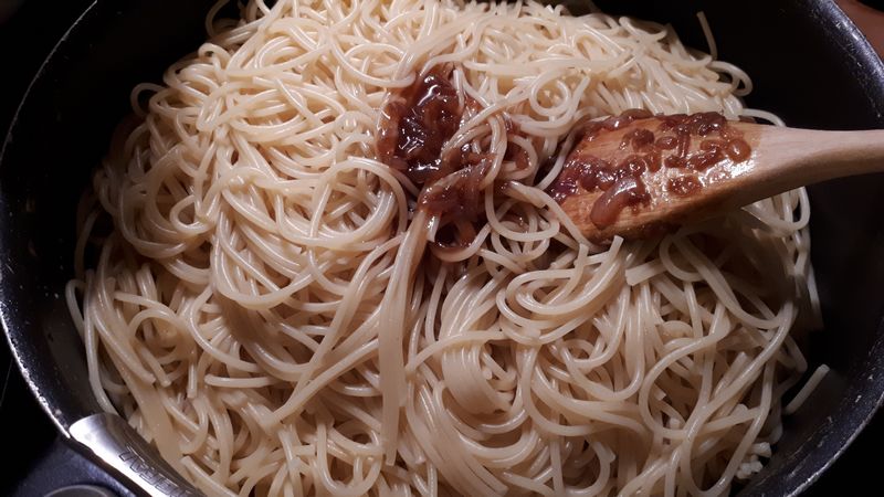 - Retirer la casserole du feu et passer la préparation dans une passoire fines et récupérer le sirop que l’on viendra ajouter aux spaghettis dans la suite de la recette. (ne pas jeter ce qu’il y a dans la passoire.)