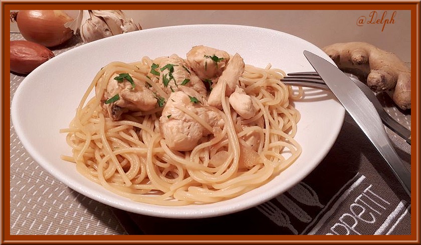 - Dans une sauteuse, faire réchauffer à feu moyen les spaghettis et incorporer le sirop jusqu’à ce qu’elles en soient toutes imprégnées. Puis ajouter le poulet et son jus et remuer le tout pendant 2/3 minutes à feu doux.