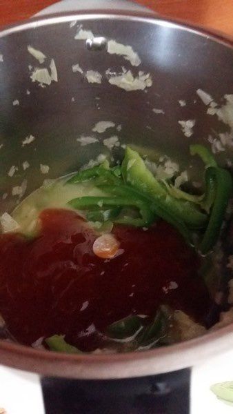 - Éplucher les oignons, les couper en deux, les mettre dans le bol et mixer 5sec/Vit5, ajouter le poivron lavé, et coupé en fines lanières, incorporer également l’eau, l’huile d’olive et le fumet de poisson faire cuire 5 min/Varoma/Vit1.