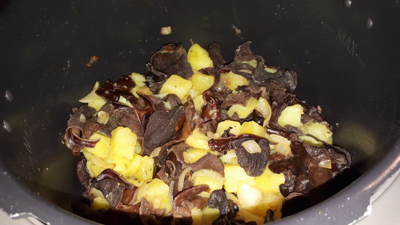 - Éplucher et ciseler votre oignon, garder les gousses d’ail en chemise, les mettre dans la cuve avec le thym effeuillé, toujours en mode dorer, mélanger et faire dorer 2 minutes, ajouter les champignons, rincés et réhydratés légèrement coupés en morceaux puis mélanger et faire dorer 2 minutes. Ajouter les pommes de terre, mélanger et faire dorer 4 minutes en remuant délicatement.