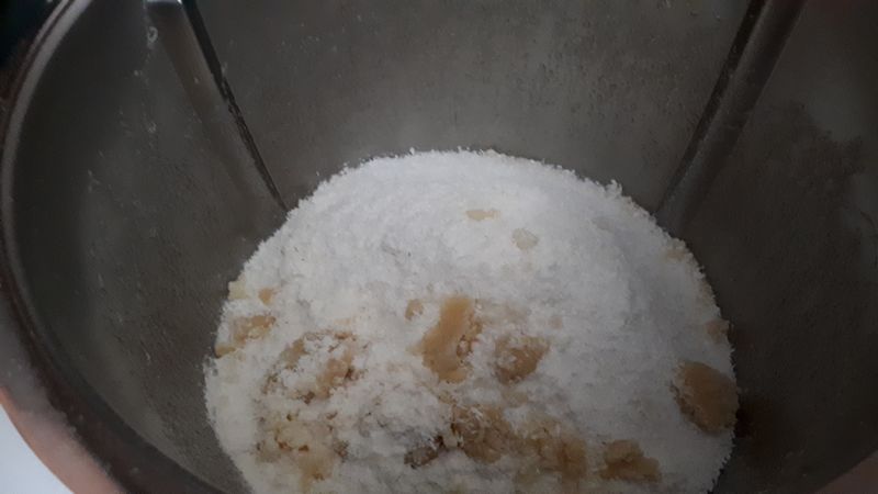 - Mettre les œufs et les sucres dans le bol du Thermomix et fouetter 1 min/vit4. Ajouter le jus d’ananas, le beurre fondu, la farine, la noix de coco râpée, et la levure mélanger à nouveau 30sec/vit3.