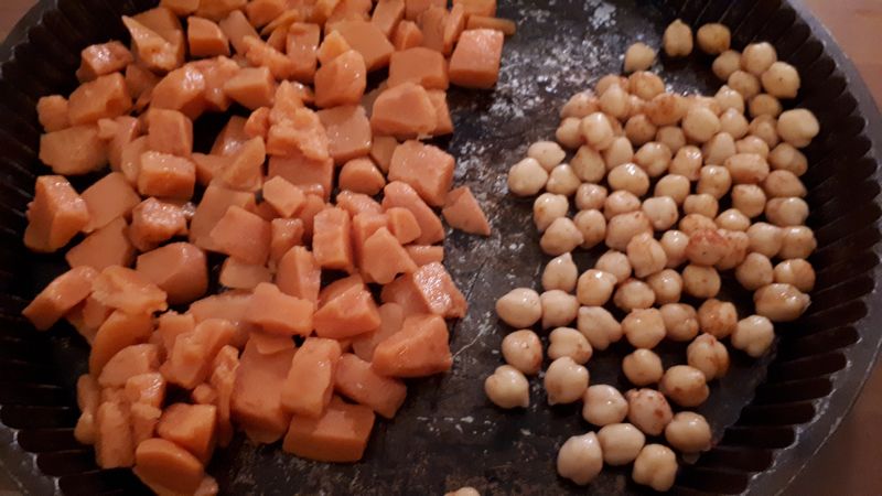 - Déposer les patates douces et les pois chiches sur une plaque de four recouverte de papier sulfurisé, saler et poivre et enfourner pendant environ 30 minutes, jusqu’à ce que la patate douce soit tendre. remuer à mi-cuisson.