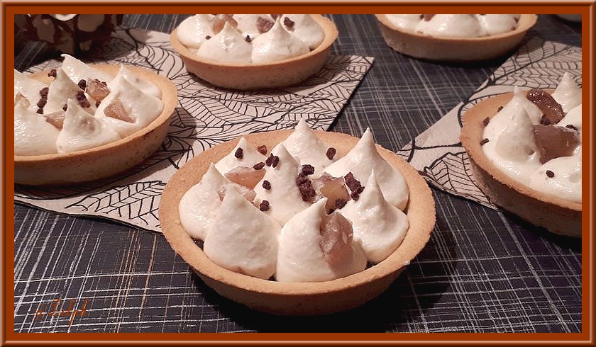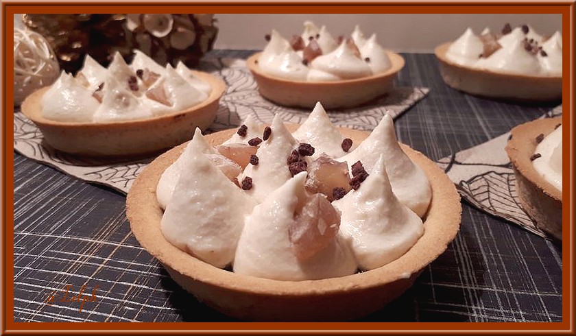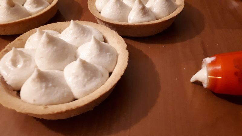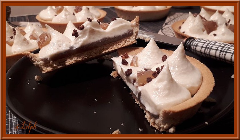 - Déposer sur les fonds de tarte une cuillère à soupe de confiture de châtaigne, bien la lisser puis pocher votre ganache, décorer avec quelques brisure de cookie ou minis meringues ( facultatif)