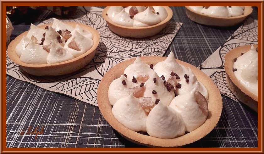 - Déposer sur les fonds de tarte une cuillère à soupe de confiture de châtaigne, bien la lisser puis pocher votre ganache, décorer avec quelques brisure de cookie ou minis meringues ( facultatif)