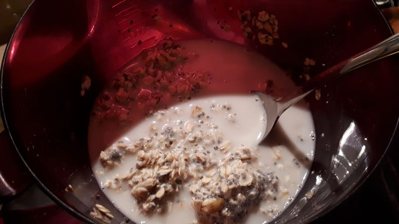 - Mélanger les flocons d’avoine avec la moitié du lait d’amande et les grain,es de chia dans un bol.