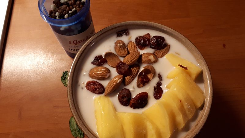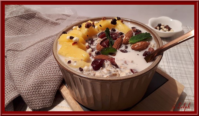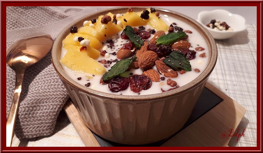 Une nouvelle idée pour un petit déjeuner sain qui vous calera jusqu’au repas du midi. Si vous n’aimez pas la mangue, vous pouvez mettre de l’ananas ou un autre fruit de saison.