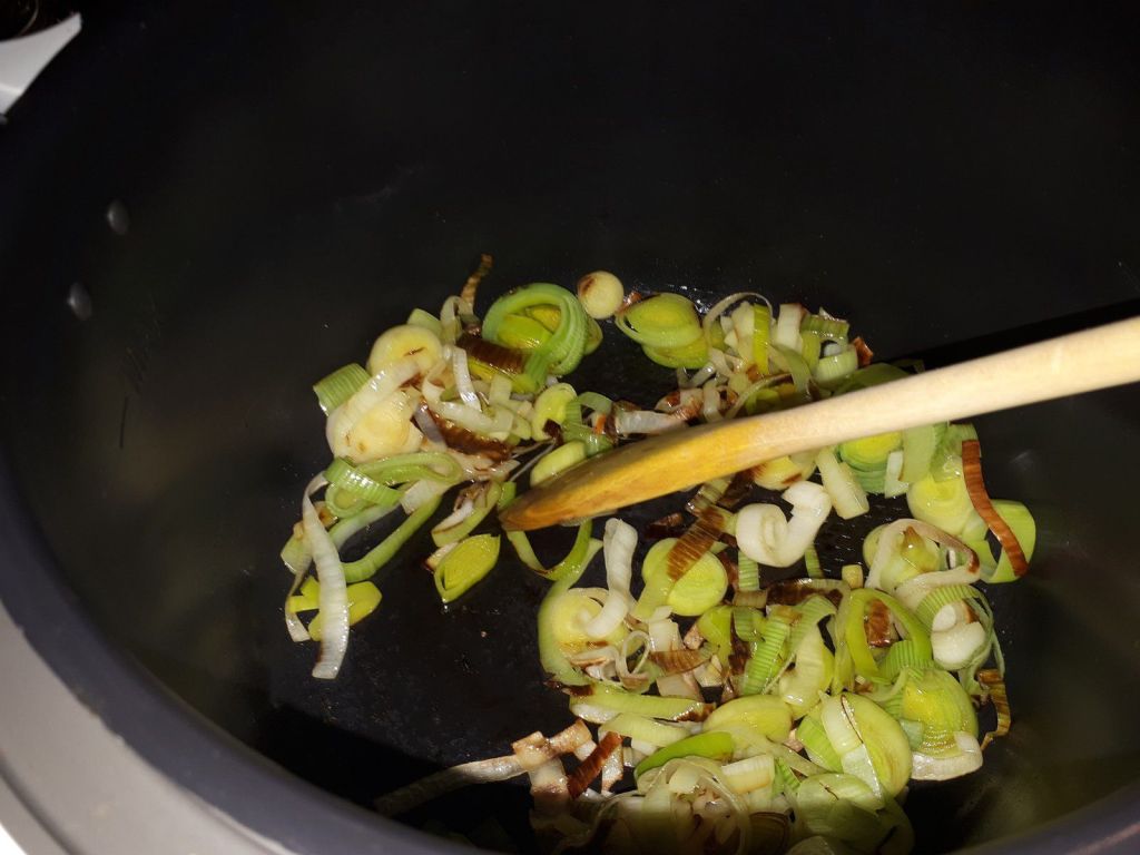 - Mettre le cookéo en mode dorer, y déposer l’huile et le poireau, faire dorer 5 minutes en remuant régulièrement.