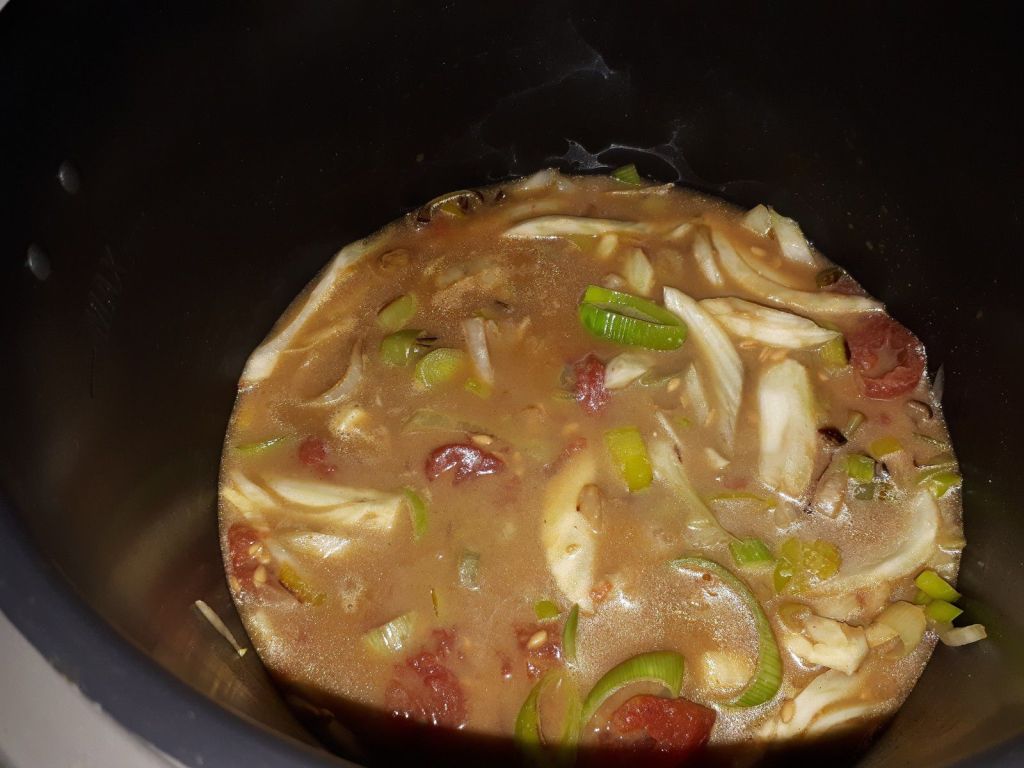 - Ajouter le fenouil, les tomates, mélanger, verser le petit épeautre, couvrir de bouillon de légumes, puis passer en mode sous pression pour 25 minutes.