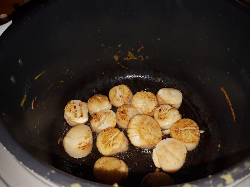 - Enlever la fondue de légumes, réserver au chaud, laisser en mode dorer, remettre un peu d’huile d’olive ou du beurre, mettre doucement les St Jacques dans la cuve les faire dorer 1 minute sur chaque face, ajouter 1 pincée de fleur de sel.